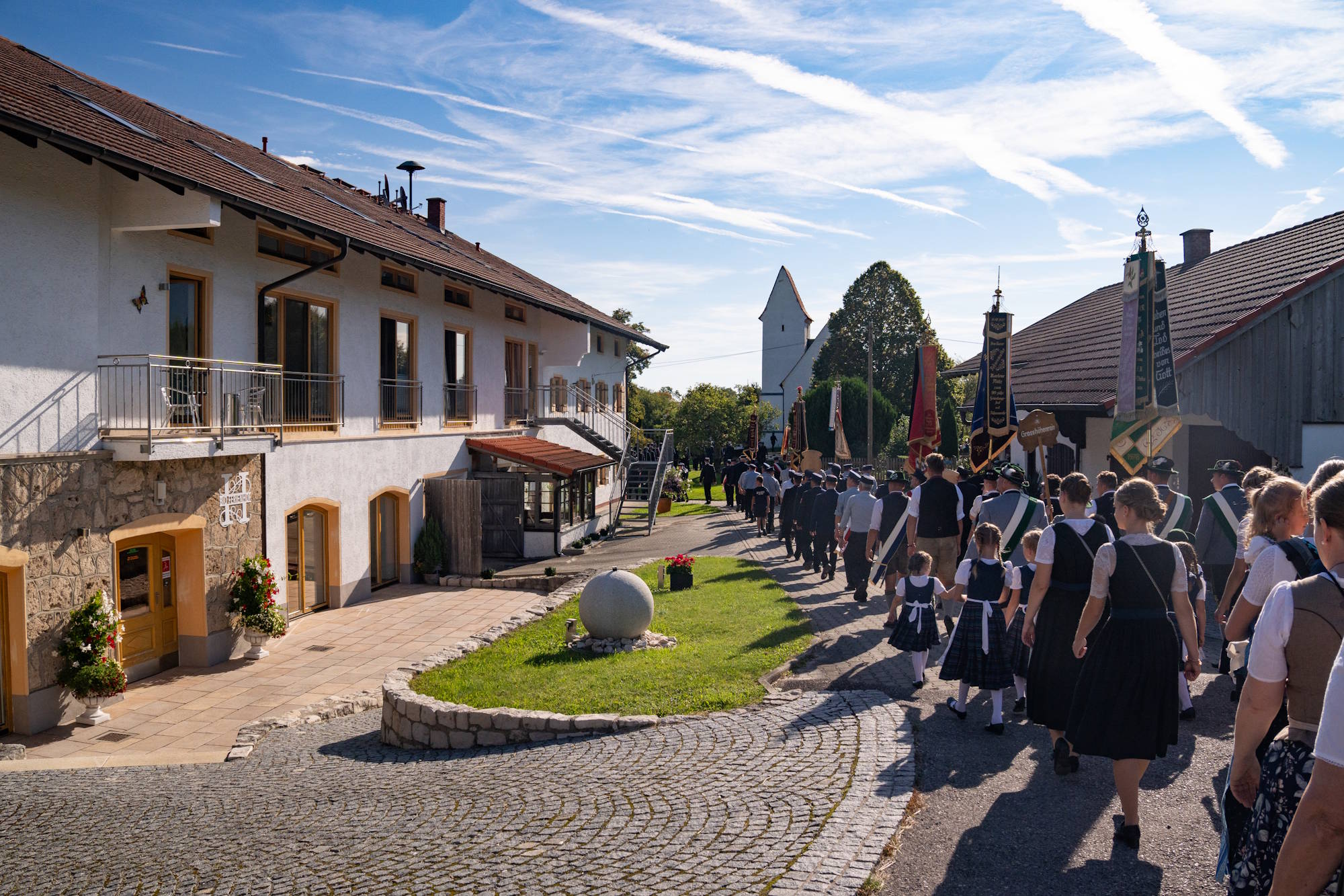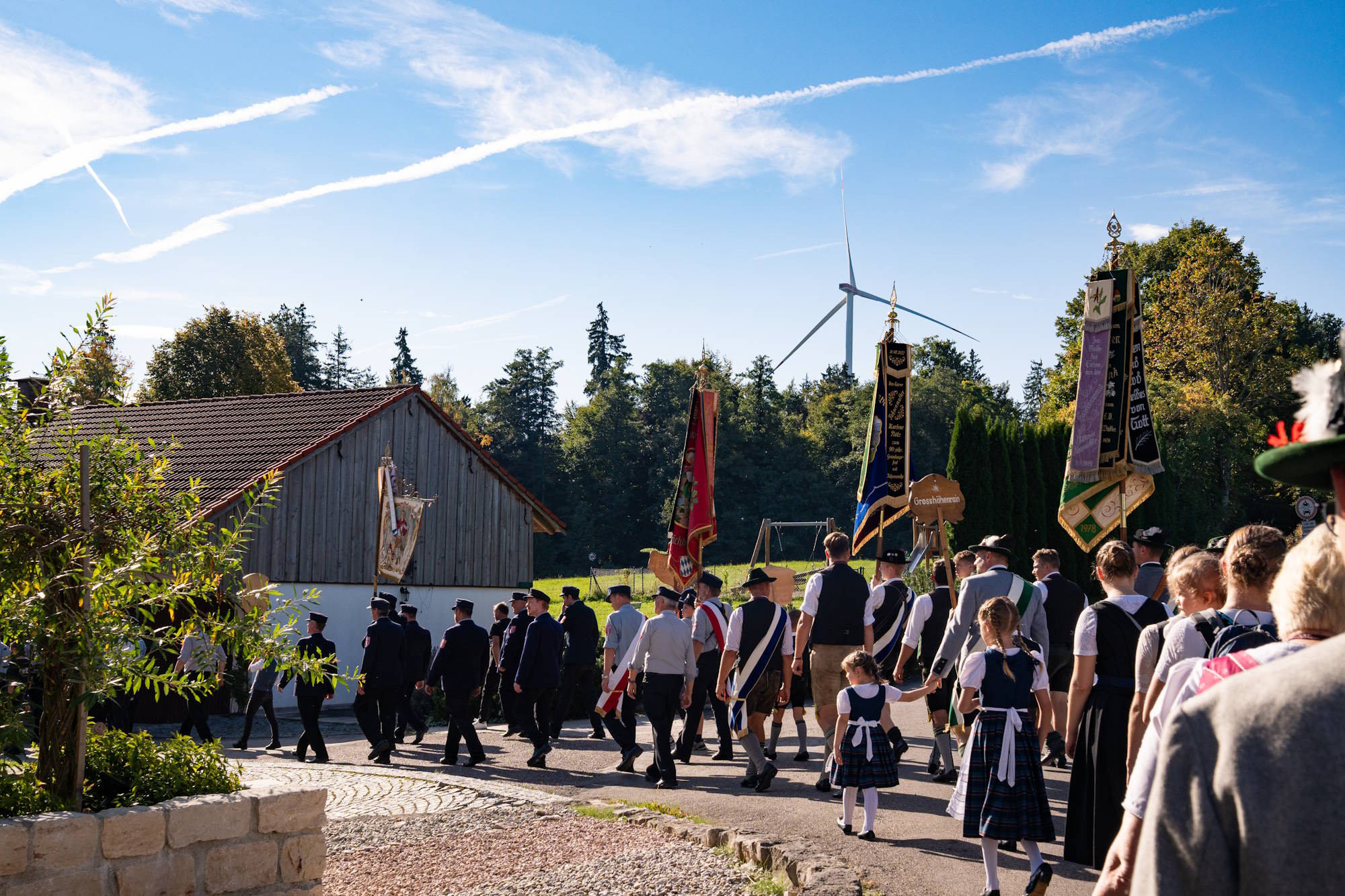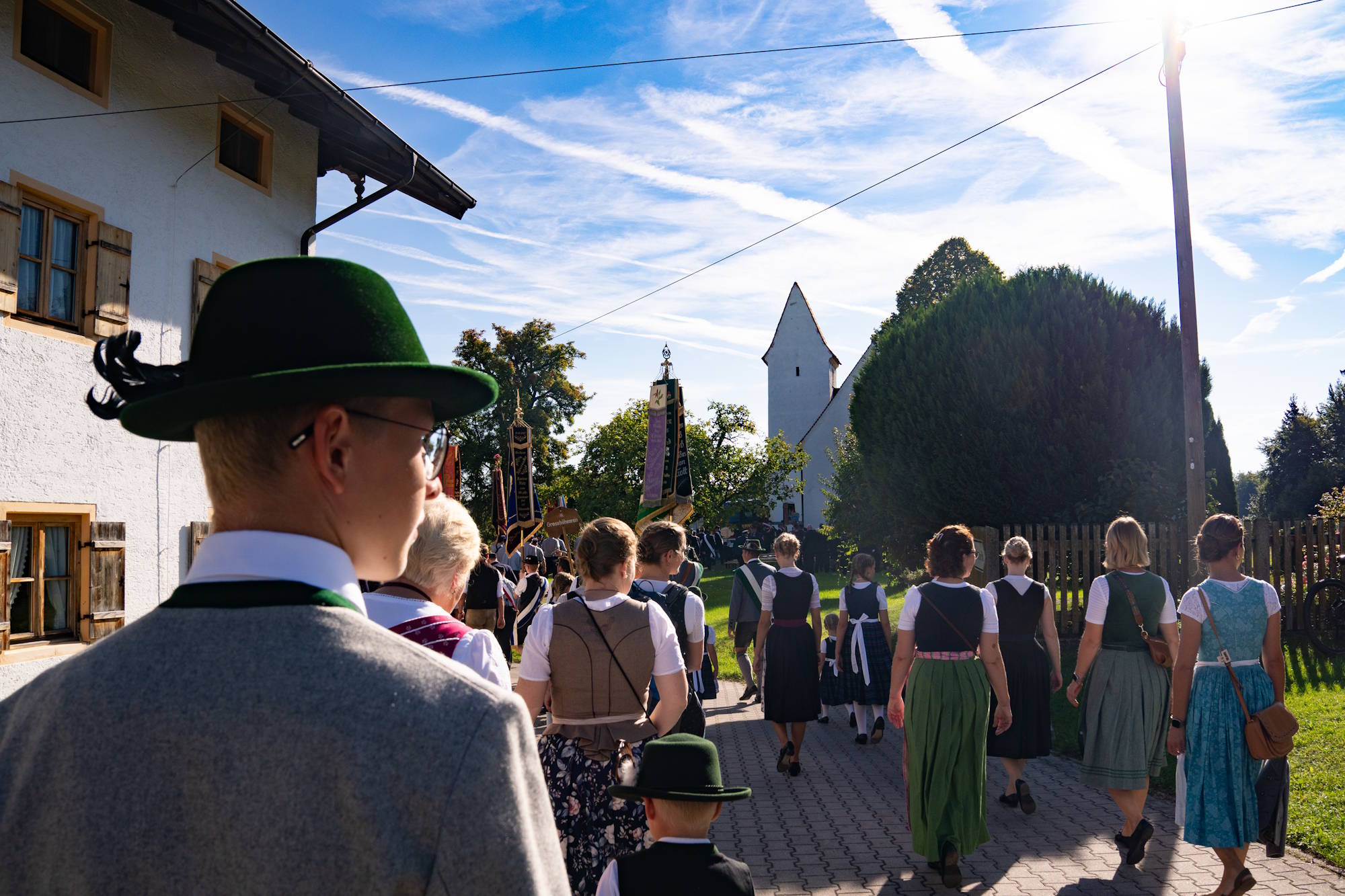 Um 09:30 Uhr wurde vor der Halle zum Kirchenzug aufgestellt. Die benachbarten Feuerwehren und die Ortsvereine waren gekommen und zogen dann hinter der Höhenrainer Musi von Krügling über die Landstraße zum Kircherl in Elendskirchen hinauf.