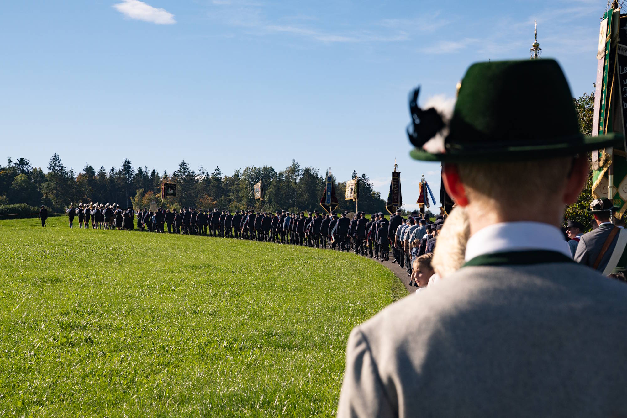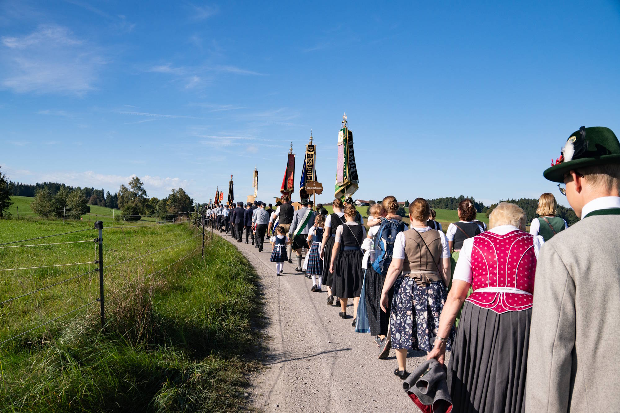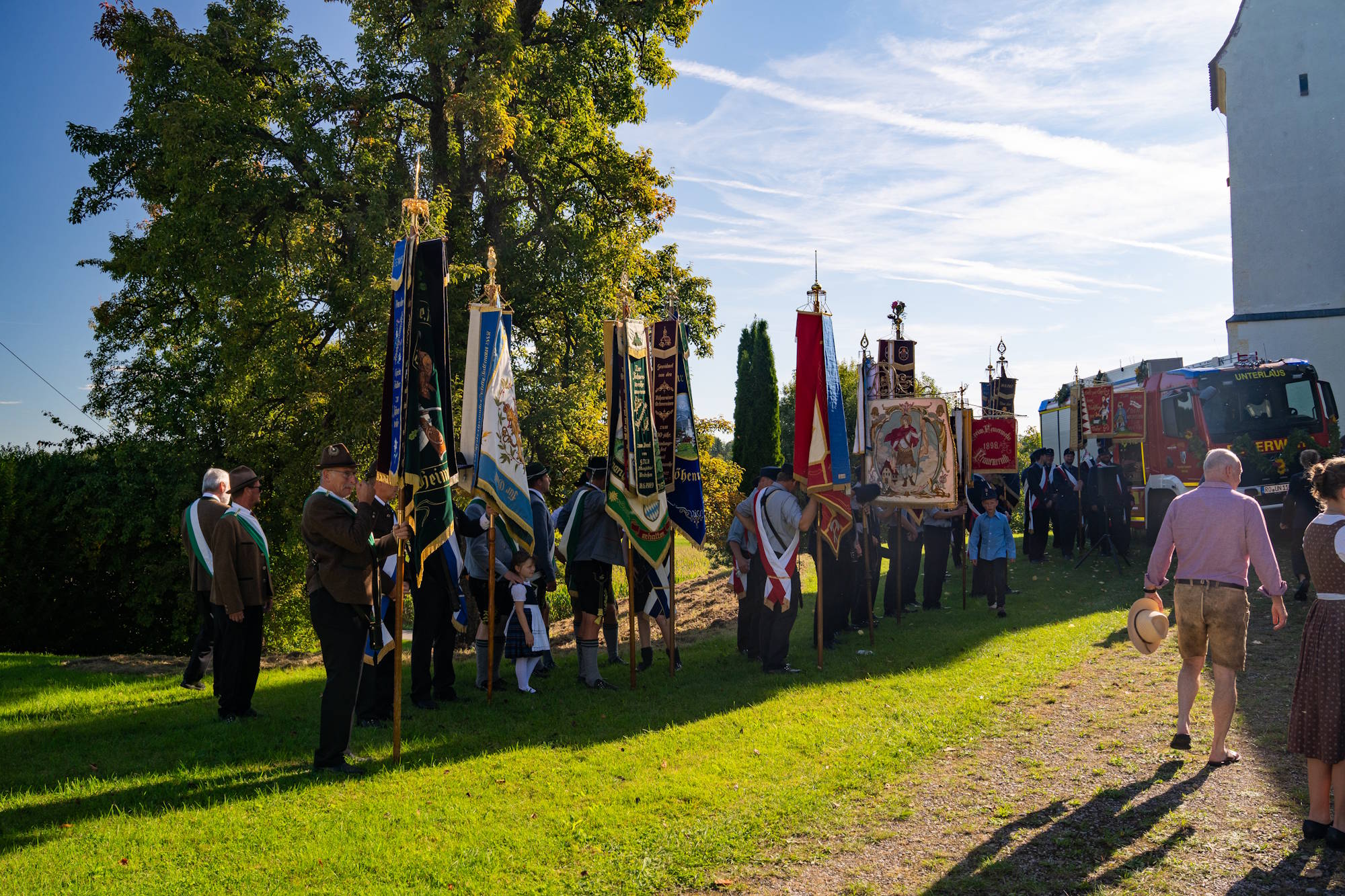 Um 09:30 Uhr wurde vor der Halle zum Kirchenzug aufgestellt. Die benachbarten Feuerwehren und die Ortsvereine waren gekommen und zogen dann hinter der Höhenrainer Musi von Krügling über die Landstraße zum Kircherl in Elendskirchen hinauf.