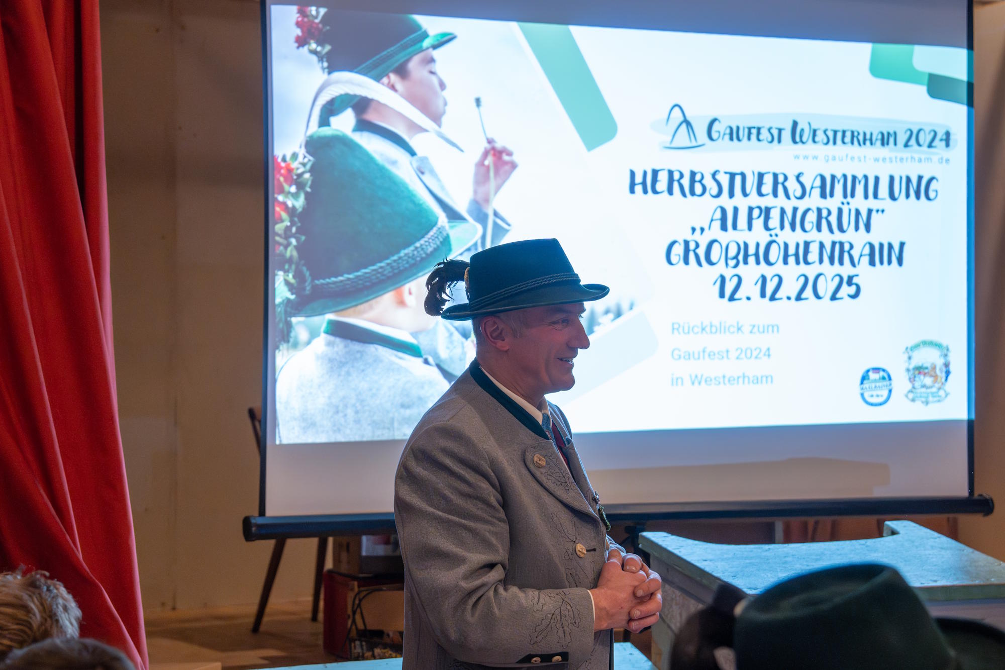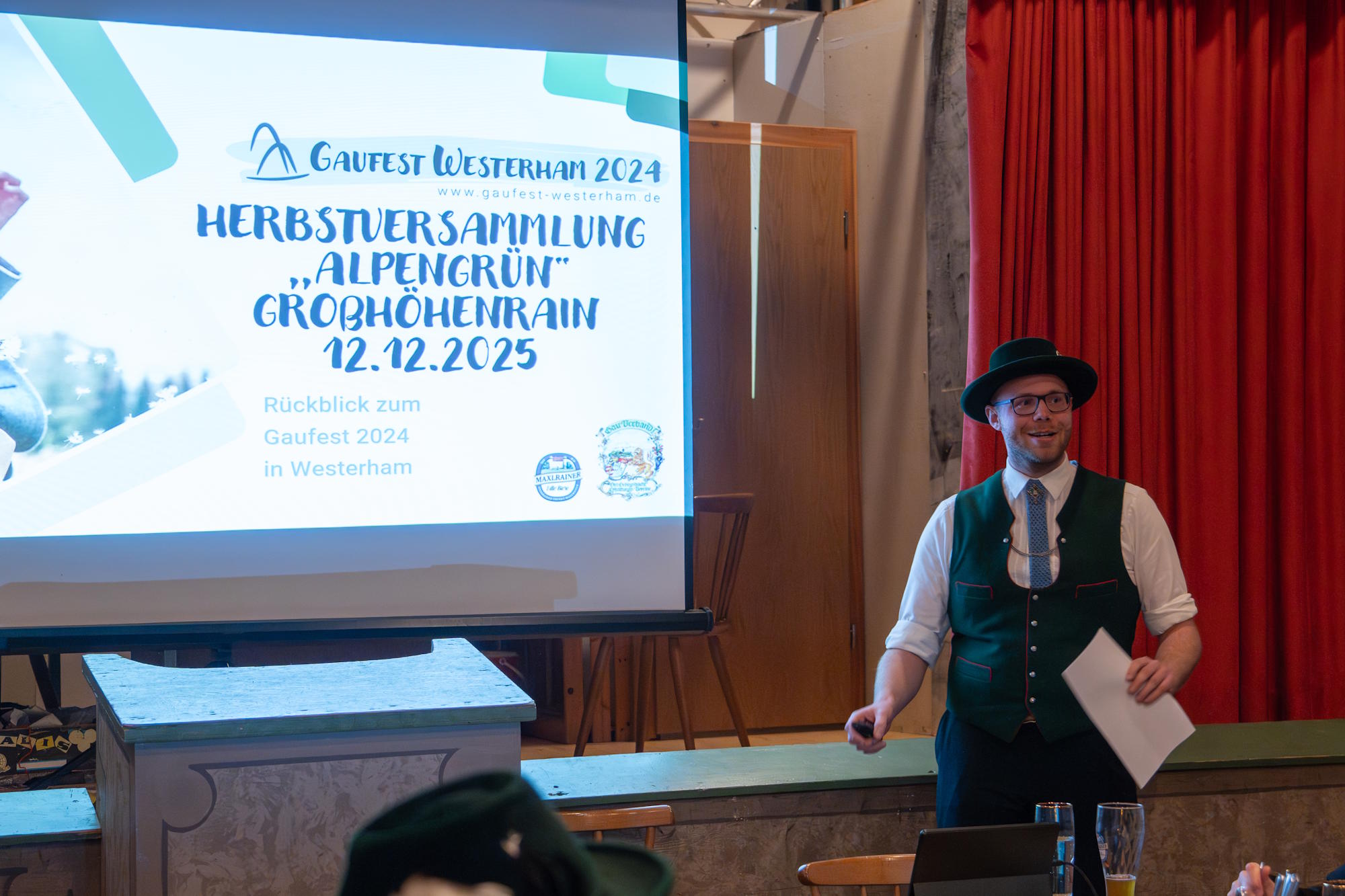 Es folgte eine Präsentation von Michael Weber vom Trachtenverein Westerham über das Gaufest 2024 in Westerham. Michael Weber war Festleiter und Hauptorganisator bei diesem größten Trachtenfest.